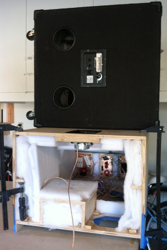 Although the top is not on, I hooked up the drivers and gave the cabinet a try to make sure all was well, using my Carvin SB5000 and Streamliner amp.